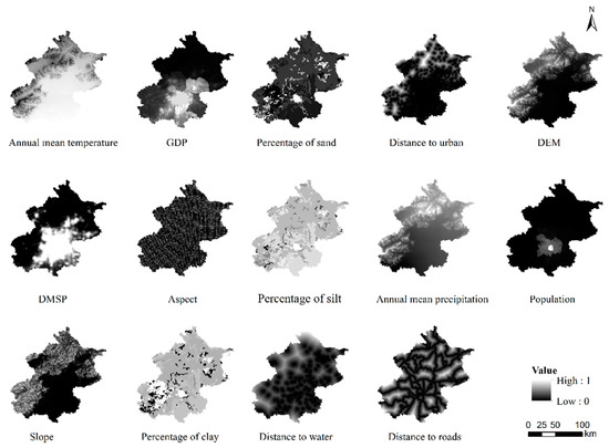 Table A1 in Appendix A depicts the required natural and socioeconomic data for this study. Beijing’s land-use data (2010–2017) were classified into: cropland, forest, grassland, shrubland, water, wetland, construction land and bare land. The same projection coordinate system (WGS_1984_UTM_Zone_50N) and spatial resolution (30 m × 30 m) were utilised for all data and all grid data, respectively.