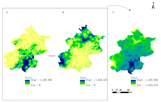 Minimal cumulative resistance surface of ecological sources (A) and urban sources (B) and the difference surface of Beijing city (A–C).