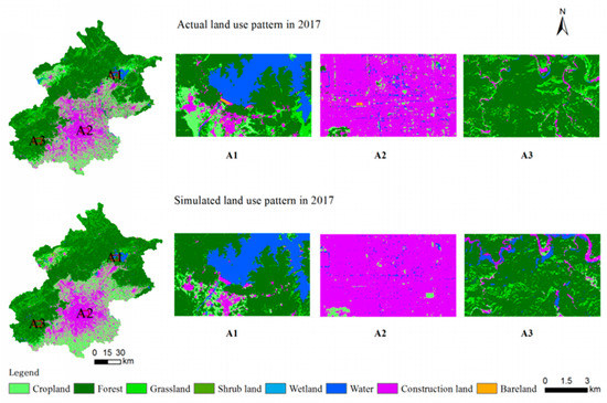 Comparison of actual and simulated landscape patterns in Beijing for 2017.