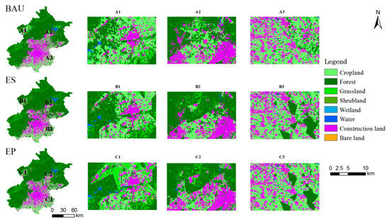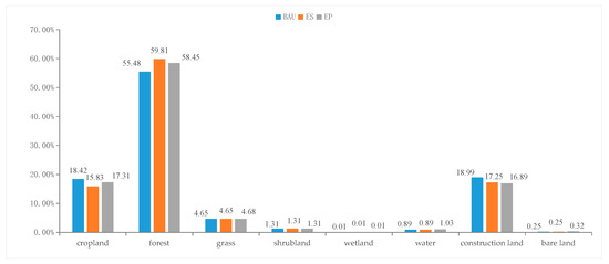 Compared with the landscape pattern in 2017, cropland, grassland, water, wetland and bare land decreased under all three scenarios, while forest, shrubland and construction land areas (under the EP scenario) increased. Taking the land-use pattern under the three scenarios into consideration, the forest had the largest area of 9803 km2 under the ES scenario, accounting for 59.81%; construction land had the minimum area of 2768 km2 under the EP scenario and the maximum area of 3112 km2 under the BAU scenario, accounting for 16.89% and 18.99%, respectively. Compared with the ES scenario, the cropland area increased by 343 km2 under the EP scenario due to cropland conservation measures. Notably, the other land-use types exhibited stability within the three scenarios. Under the ES scenario and EP scenario, the ecological control zone had no construction land and cropland with productive functions in terms of spatial distribution. In contrast to the BAU scenario and ES scenario, under the EP scenario, the proportion of construction land decreased slightly with a more compact distribution, which prevented disorderly city expansion. In this way, the spatial structure of the city was further optimised.
