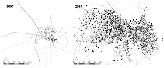 Among numerous explored settlements, Gbessa (8°55′49.57′′ N, 7°15′19.36′′ E) was selected as a case study to analyse the process of morphogenesis. The settlement is fairly flat and relatively far from the first joint with the main road (about 3.3 Kilometres) and other large urban settlements (about 6 Kilometres from Kuje). Figure 1 shows how the settlement has evolved rapidly from 2007 to 2019. It is critical to avoid conceptualising informal/formal as apposing dichotomies with some clear boundaries and binary distinctions since urbanism embodies a mix of informality and formality [79]. A more nuanced and complex approach is required to explore cities in Africa as informalisation/formalisation processes work together to produce urban forms and economies [80] (pp. 8–9). The informal/formal conceptual field developed by Dovey and Kamalipour [15] has enabled us to locate the selected case study based on the informality/formality of the access network and buildings. Our case study selection rationale is primarily morphological, and the conditions of tenure, living, or legality have not been among the case study selection criteria. The focus of this paper is on a single case study and there is no claim here for generalisability to other settlements in the context of the global South and beyond.