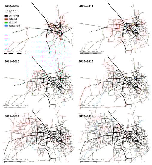Figure 2 shows the analysis of the emerging access network and the related increments of change in the selected case study. We identified three types of spatial transformation, namely add, alter, and remove. The underlying agencies of the outlined types are reflected in the ways in which they are characterised as verbs. The identified types of incremental change have been mapped using red, green, and blue in Figure 2 to illustrate those parts of the access network that have been added, altered, or removed, respectively. The existing parts of the emerging access networks at a given time in each increment are also illustrated in Figure 2 using a black colour. The key attributes of the outlined increments of change are addressed in the following sections.