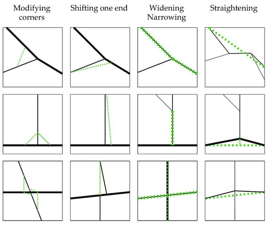 Alter is another common increment of change where elements of the access network adapt in response to the changing condition often to facilitate the emerging patterns of movement. Alteration incorporates a range of incremental adaptations. Following the analysis of the emerging access network in Figure 2, we identified different alteration types, namely modifying corners, shifting one end, widening/narrowing, and straightening. The identified forms of alteration are further illustrated in Figure 3 to show how each type plays out. As a form of alteration, corner modification takes place to smoothen the transition between intersecting segments of the access network often to enhance the flows of movement. Shifting one end is another form of alteration where changing one end of certain segments becomes a typical adaptation within the access network. This includes minor adjustments of the emergent parts of the access network in each increment. There are a few examples of this form of alteration (Figure 3). This type often takes place in relation to emerging flows of movement. Another key type of alteration is about forms of widening or narrowing some existing parts of the access network. Widening often takes place where the trajectory of movement remains relatively unchanged along certain parts of the access network, which often accommodate movement flows and stay put over time. It seems that choice and likelihood of use play a key role here as the network becomes expanded over time. Those parts of the access network, which have been used more frequently, are likely to become wider and maintain their trajectory over time. Widening is then a form of spatial stabilisation. There have also been only a few instances of narrowing over time. Straightening the trajectory of movement is one of the primary forms of alteration, which often takes place along some windy parts of the access network. Straightening the movement trajectory can become particularly important in the process of expanding the access network to enhance the continuity of movement flows.