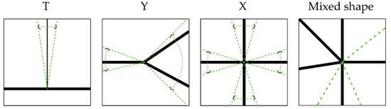 The emerging junctions are integral to the evolution of the access network. The incremental production of the access network gives rise to the emergence of multiple forms of junctions. Some of these junctions become consolidated over time. Following the analysis of the emerging access network, we identified four primary types of junctions, namely T, Y, X, and Mixed shape, by exploring how different movement trajectories intersect. This typology is primarily morphological with a focus on the spatial patterns of emerging junctions. The outlined types are illustrated in Figure 4, and their key characteristics are explored in the following sections.