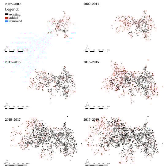 Add is the most prevalent increment of change. Figure 2 shows how the existing access network became expanded over time through a number of additions in each increment from 2007 to 2019. The extent of the spatial evolution through expansion is not necessarily the same across different increments. Nevertheless, the overall spatial expansion of the access network is more towards the West than the East side of the emerging settlement due to some pre-existing features in the East, including a major road and waterway. While such features may enable a range of possibilities at the macro scale, they can constrain spatial expansion towards certain directions at the settlement scale. Pre-existing features at the settlement scale seem to play a crucial role in the ways in which new segments have been added to the existing access network in each increment. The emerging segments of the access network often follow the trajectory of some existing pathways and physical traces of linear movement on the ground. Certain patterns of informal movement leave physical traces, which can then be picked up to guide the evolution of the emerging access network in process of self-organisation. The impact of the pre-existing pathways on the emergence of access networks has been previously outlined by Ribeiro [27]. Pre-existing features have the capacity to guide the formation of an emerging access network. Yet, parts of the access network do not necessarily follow the existing traces of physical movement on the ground (Figure 2). A key characteristic of the addition type lies in its capacity to enhance spatial connectivity. The evolvement of the access network is geared to the provision of physical access to emerging buildings, and the emergence of new pathways in each increment often corresponds with the addition of new buildings. The relations between the emerging access network and buildings will be addressed later.