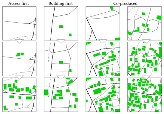 Following the analysis of the emerging access network (Figure 2) and building footprints (Figure 5), we identified three forms of relation: access first, building first, and co-production. Figure 6 illustrates the relations between the emerging access network and buildings. Access first is a primary form of incremental development. The initial stages of development show many footpaths that would later become integrated elements of the access network. These elements are often outgoing pathways formed over time, connecting to external resources, such as waterways, roads, nearby settlements, or farmlands. The building footprints emerge around these elements after being established as a part of the access network. Observations indicate that the most significant access network elements have emerged in relation to external destinations prior to building footprints. Building first is another key form of incremental development. In some cases, new structures encourage the formation of new access network elements. Generally, a new building cannot be constructed without an initial link to the existing access network. Nevertheless, these new buildings often become connected to the access network via more than their initial construction link. The new buildings, in this case, are often emerging destinations that influence the future development of the access network. Observations indicate that the new buildings often tend to reach the existing access network via the shortest available line. Hence, the emerging pathways in this process are more likely to form T-shape junctions. Co-production is a prevailing form of incremental development where access network and buildings co-evolve in emerging settlements. Most changes in the internal spatial structure of the settlement have come about through adaptive processes of co-production, enabling an ongoing interaction as the access network elements and building footprints evolve. The co-produced spatial structure is the result of many incremental steps linking the emerging access network and buildings. The analysis shows new buildings that remove an existing shortcut, and, simultaneously, influence the formation of new access network elements. The new buildings may also impact the previously mentioned altering processes of modifying corners, shifting one end, widening, or straightening.