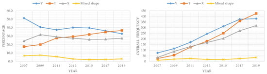 Earlier in this paper, we analysed the emergence of different junctions and categorised them into the T-shape, Y-shape, X-shape, and Mixed shape junctions based on their morphological types. In what follows, we discuss how certain types of junction emerge more frequently than others and how the percentages of different types also change over time. Figure 7 shows how the frequency and percentage of each junction type changed over time. The frequencies and percentages of different types have been analysed over time by counting the number of each junction type from 2007 to 2019. While the percentage of the X-shape junctions remains relatively unchanged, particularly after the early development process, the percentages of the T-shape and Y-shape junctions have considerably changed over time. We found two significant trends of change in the percentages of specific types, mainly the T-shape and Y-shape junctions. The emergence of the Y-shape and T-shape junctions has also been observed by Ribeiro [27] in Vila Paranoa where the formation of the Y-shape junctions was associated with diverging/converging patterns of movement in the initial stage of development. The emergence of the T-shape junctions was then associated with how the primary network of pathways met the secondary network of pathways in the subsequent development stage [27] (pp. 295–296). This is a significant finding in the context of emergent morphologies since the outlined types of junction incorporate different patterns of movement, as shown by Ribeiro [27] (pp. 296–297). Figure 7 shows how the percentage of the Y-shape junctions drops as that of the T-shape junctions rises from 2007 to 2019.