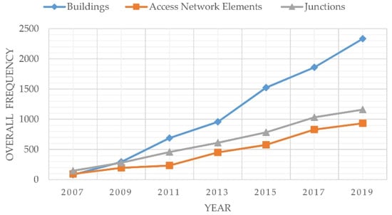 The frequencies of the access network elements, junctions, and building footprints 2007–2019.