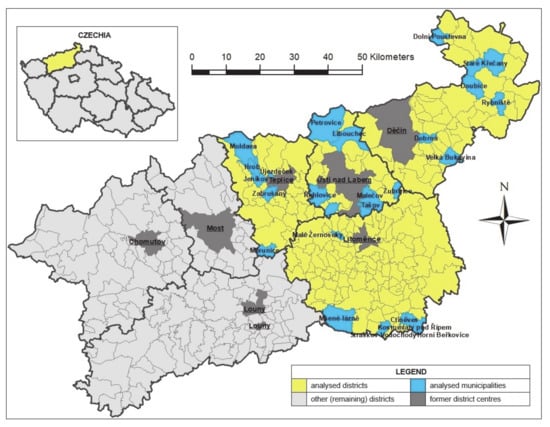The spatial scope of the research was limited to municipalities in one of the Higher Territorial Administrative Units of the Czech Republic, namely, the Ústí Region. This territory is further divided into seven districts, which are of administrative and statistical significance. The research took place in only four of these districts, located in the central and eastern parts of the Ústí Region, namely, the districts of Teplice, Ústí nad Labem, Děčín, and Litoměřice. The remaining three districts of Chomutov, Most, and Louny were not taken into account, as a relevant research sample was already assembled using the first four districts mentioned.