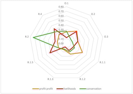 Figure 3 shows the distribution of land tenure attitudes across the three core beliefs. It is a radar chart that aims at identifying the overlap between variables []. The values consist of the number of organizations that have a sentence attributed to a given theme divided by the total number of organizations in the given core belief group.
