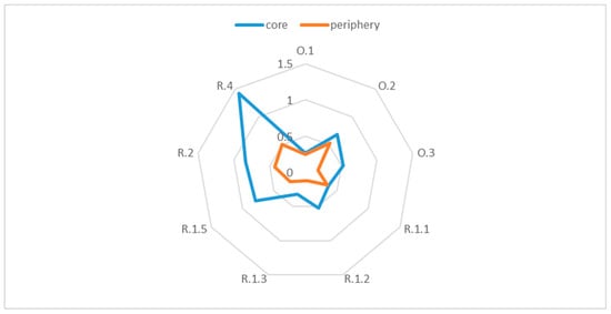 Our analysis of the long-term mutual policy support network revealed a core–periphery structure. We identified three clusters with a low level of density ranging from 0.2 to 0.3 and a low overall graph clustering coefficient (0.379). In social network analysis, a core–periphery structure describes the combination of a densely connected core and a much less connected periphery. It is one of the most widespread network structures []. Table 2 illustrates the features of the network’s core and periphery. Table 3 shows that the core contains all three core beliefs.