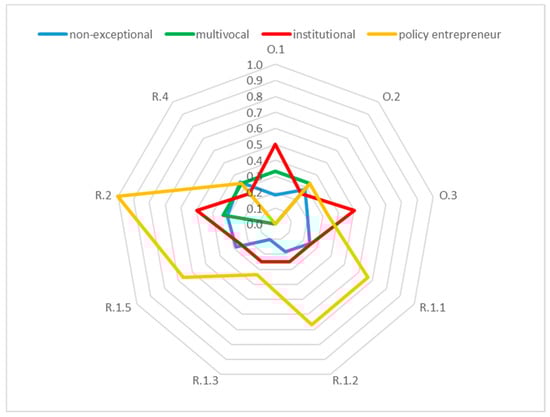 Given the importance of these key policy actors in influencing policy outcomes, we analyzed where their narratives on land tenure attitudes were positioned in the networks. Figure 5 shows the distribution of land tenure attitudes among the various types of actors with exceptional agencies as defined by Christopolous and Ingold []. It shows that non-exceptional actors have quite a neutral discourse that does not feature any clear land tenure attitude.