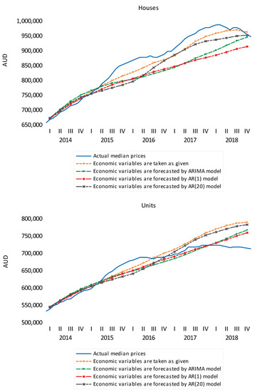 Panel B of Table 3 shows the results of conditional forecast when the underlying economic variables are unknown and must be forecasted. Two popular and widely-applied time-series forecasting techniques (ARIMA and AR models) were considered in this analysis. The results show that using an AR(1) process in the underlying economic variable forecast produced the best forecasting results for units, while an AR(20) process produced the best forecasting results for houses. The ARIMA model produced somewhat forecasting results in between an AR(1) and AR(20) process. The results showed that the forecasting performance of developed models is conditional on the assumed knowledge of underlying variables. As AR(1) and AR(20) processes tend to set the boundary of forecasting, we chose to rely on the more sophisticated ARIMA model and selected AR(1) and AR(20) processes for future price forecasting in the next section. The results provide some insights into forecasting for decision-making under different underlying variable assumptions.