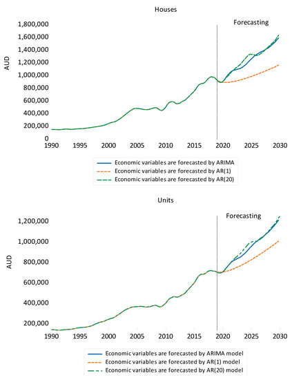 It shows that housing prices are more likely to follow a high-growth scenario, as indicated by the ARIMA underlying variable assumptions; the market will bottom out in 2019–2020 and continue to grow in the future. Under this scenario, the median price will reach AUD 1,596,568 for houses and AUD 1,217,315 for units in 2030, presenting an annual compounding growth rate of 5%. This forecast is supported by the alternative variable assumptions following an AR(20) process. Even in a low-growth scenario, as indicated in the AR(1) variable assumptions, there will be no significant price decline in the foreseeable future; rather, prices will mostly be flat or in a slow-growth mode with an average annual growth rate of 2% in the next decade.