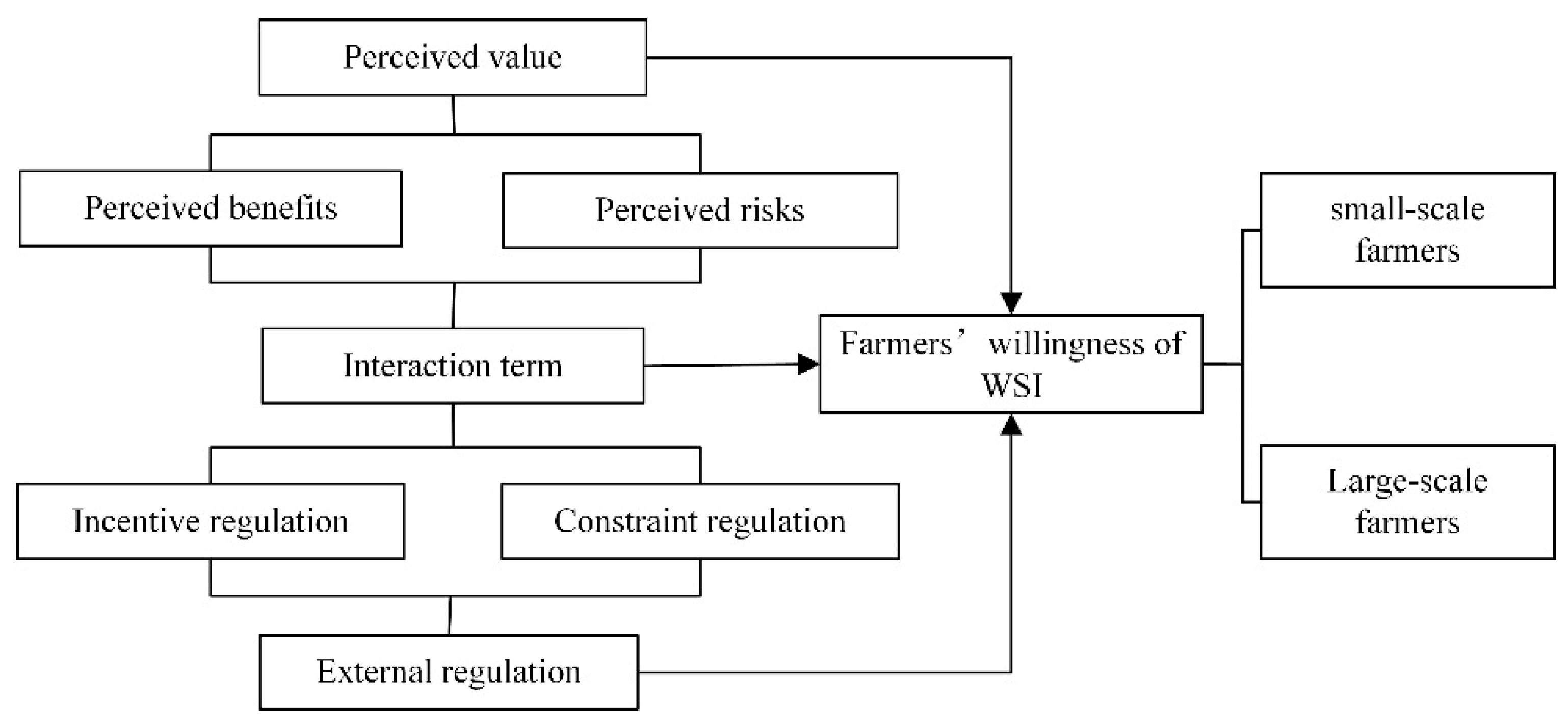 3.4. The Effect of Perceived Value and Government Regulation on the Willingness to Adopt WSI Based on Farm Scale