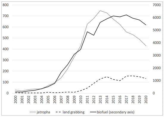Number of academic articles published on iatropha, land grabbing and biofuels between 2000 and 2020, source: author, data from a Web of Science search carried out on 25 February 2021.