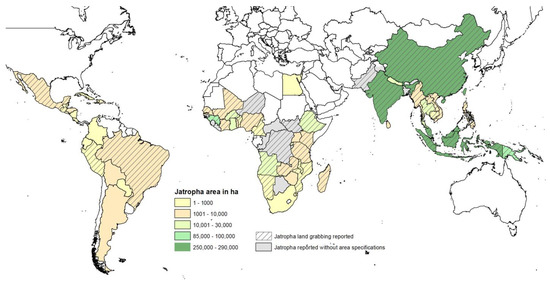 Global jatropha area estimates, source: author, area estimates from BioZio [71], Castro Gonzáles [72], GEXSI [63], GRAIN [73], van Eijck et al. [74], Wahl et al. [75], and Walmsley et al. [68]; cases of land grabbing as reported by The Land Matrix [22], (data of 2017).