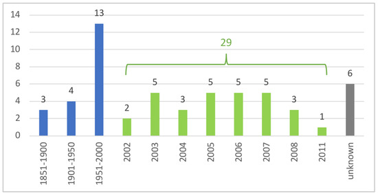 Finally, the largest group of jatropha investors in India was the sub-group of SMEs within the group of Indian companies. This research identified a total of 34 companies that ventured into jatropha between the early 2000s and 2011. Some of these were Indian subsidiaries of international SMEs and some were joint ventures between TNCs or large Indian companies and local partners such as small companies and NGOs. A few joint ventures were also established between government agencies, research institutions and third parties to raise jatropha plantations and that way “national planners’ enthusiasm for the species rubbed off easily on research organizations and universities that rely heavily on the Planning Commission for funding” [78] (p. 7115). Of the remaining 27 Indian SMEs, 15 were established from 2002 onwards. They represent the majority (52%) of companies that were founded around the jatropha hype in India. Of the total of 55 companies identified, 29 or 53% were founded between 2002 and 2011 (see Figure 4).