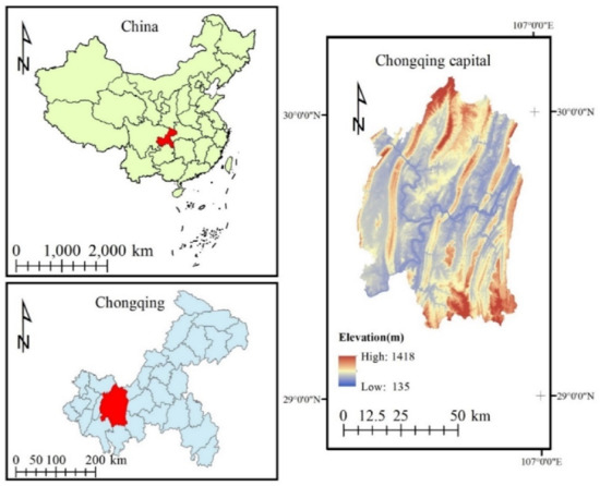 Chongqing is in southwest China, in the upper reaches of the Yangtze River (Figure 1). The capital of Chongqing is its administrative and economic center. It covers a total area of 5470 km2 and has nine districts under its jurisdiction, with a total population of nearly 8 million. The landforms of Chongqing are dominated by mountains and hills, of which mountains account for 76%, giving it the name “mountain city” [20]. Since the most influential development strategy in China, named Reform and Opening Up in 1978, Chongqing has undergone great changes in social and economic aspects over four decades. From 2000 to 2018, almost every year, the annual GDP growth rate of Chongqing exceeded 10%. In 2019, the GDP of Chongqing was USD 342 billion, with a medium to high growth rate (6.3%), and GDP per capita just exceeded USD 10,000 [21]. Economic development has brought rapid urbanization, with the urban population increasing from 35.6% in 2000 to 65.5% in 2018. According to the latest Eco-redline delimitation plan released by Chongqing Municipal People’s Government [22], the ERAs in Chongqing capital cover 912 km2, accounting for 17% of the total area. As there was no GIS data of the ERAs available, we produced vector data from a digital Eco-redlines map, showing the spatial distribution of the ERAs. The digitized ERAs covered a total area of 906 km2, which is very close to the official datum (912 km2).