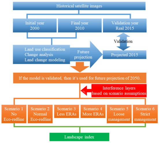 Figure 2 demonstrates the framework of the analysis. Generally, it can be divided into the following steps: the construction of the land change model, the setting and conversions of the scenarios, the generation of future LULC images, and the calculation and statistical test of the landscape indices of the LULC images. First, cloud-free historical satellite images of 2000, 2010, and 2015 were acquired. The satellite images were then used to conduct LULC classification. The classified 2000 and 2010 LULC images were then used for land change modeling. A predicted 2015 LULC was created using the model and compared with the real 2015 LULC image. The model was then readjusted multiple times until satisfactory accuracy was obtained. Once the model was ready, the second step was the setting and converting of scenarios. Six scenarios based on different assumptions which incorporated the change of area and management intensity were proposed. The interference layers corresponding to different scenarios were generated and loaded into the model to simulate the future LULC images in 2050. Next, to compare the differences between these LULCs under different scenarios, several key forest patch landscape indices were calculated for each scenario. Finally, the landscape indices were used for statistical tests to find the effectiveness of the change of area and management intensity of ERAs. The following sections will provide more detailed explanations.