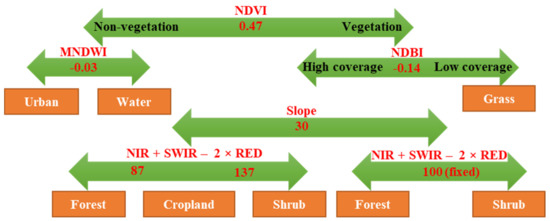 We encountered two challenges in the LULC classification of the study area. One was that the LULC was fragmented, and the other was the influence of cloud, fog, and haze. After many attempts to classify the satellite images using various common classification methods (e.g., supervised classification, unsupervised classification, and segmentation classification), decision tree classification was employed to minimize the errors and inconsistencies in images from different years and classify the images. The indices and calculation methods are shown in Table 1. Considering convenience during later modeling and the reality of LULC in Chongqing capital, the satellite images were classified into six LULC categories: urban, cropland, forest, shrubland, grass, and water, which refer to the categories defined by the Chinese Academy of Sciences and were slightly adjusted [25]. Figure 3 illustrates the classification process, taking August 2010 as an example. The digital numbers of each band were linearly stretched from 0–255 and then used to calculate the indices. The thresholds of the indices of all six images are presented in Table 2.