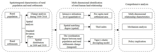 To resolve the three outstanding issues mentioned in the Introduction, a research scheme was formulated, which is shown in Figure 2. Firstly, based on the rural population and rural settlements data in 2009 and 2018, the methods of spatial analysis and standard deviation ellipse were used to quantitatively describe the spatiotemporal characteristics of rural populations and rural settlement area. Secondly, the per capita rural settlement area, the Theil index, and Tapio’s elastic decoupling model were adopted to conduct the multi-dimensional identification of the rural human–land relationship from the aspects of intensive utilization level, spatial matching degree, and change coordination degree. Finally, the multi-dimensional characteristics of the rural human–land relationship are comprehensively analyzed, and the formation mechanism and policy implications are discussed.