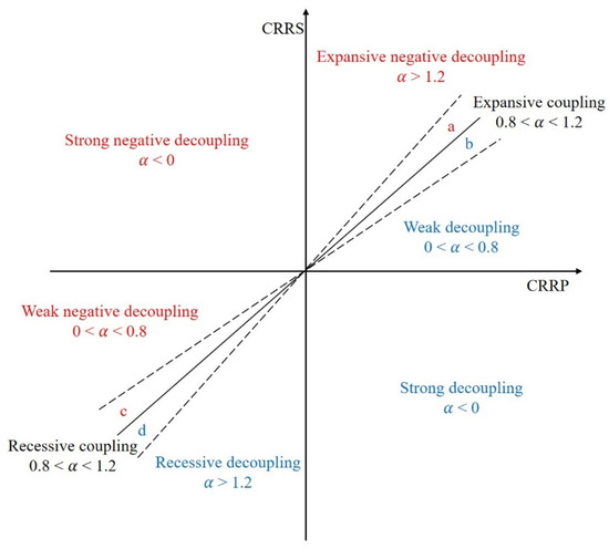 The eight types of rural human–land relationship examined in this study. Notes: CRRS is the change rate of rural settlement area, while CRRP is the change rate of the rural population. Here, a and d indicate the subtypes of expansive coupling and recessive decoupling with 1 < α < 1.2, respectively; correspondingly, the b and c indicate the subtypes of expansive coupling and recessive decoupling with 0.8 < α < 1, respectively. The red font indicates the more extensive use of rural settlements, and the blue font indicates the more intensive use of rural settlements.