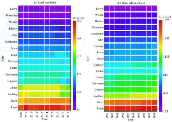 The county statistics of rural settlement areas in 2009 and 2018 were obtained from the Land Survey and Planning Institute of Shandong Province. In 2009, China completed the second national land-use survey, on the basis of which land-use change surveys have been conducted yearly. Therefore, 2009 to 2018 was selected as this study’s research period to ensure the consistency, accuracy, comparability, and authority of the data analyzed. Rural population data were obtained from statistical yearbooks of municipalities in the corresponding years.
