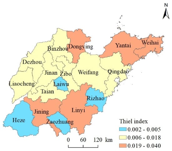 Spatially, the Thiel index was relatively high in cities located in northern Shandong (Figure 7). The Thiel index of cities in southern Shandong showed evidence of polarization, in that lower values (for Heze, Zaozhuang, and Rizhao) and higher values (for Jining and Linyi) are arranged alternately. The Thiel index of each city featured particular regional differences, however, it did not correspond fully with the location and level of socioeconomic development across space.