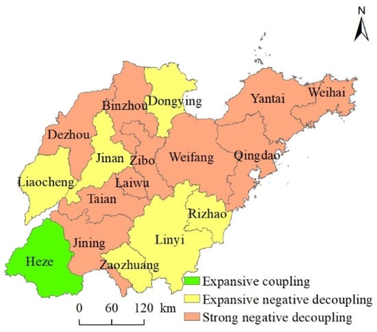 During 2009–2018, the relationship between the changes to the rural population and rural settlement consisted of three types: strong negative decoupling, expansive negative decoupling, and expansive coupling (Figure 8). Among them, the strong negative decoupling type dominated, characterizing 10 of the 17 cities (58.82%) that were mainly distributed in a southwest-to-northeast direction. In these 10 cities, the rural human–land relationship is unbalanced as there is a decrease in its rural population but an increase in its rural settlement area. Therefore, this change will further intensify the extensive use of rural settlements. Dongying, Jinan, Liaocheng, Rizhao, Linyi, and Zaozhuang all belong to the expansive negative decoupling type, and they are distributed on either side of the strong negative decoupling type. The rural population and rural settlement area in these areas both increased; however, the increasing speed of expansion of rural settlement area has overtaken the growth of the rural population, so their ratio was greater than 1.2. Consequently, this change will also aggravate the extensive utilization of rural settlements. Only the changes to the rural population and rural settlements in Heze showed a coordinated relationship. There was little difference found between the growth rate of the rural population and that of rural residential area in Heze city, but its rural settlement area expanded faster than its rural population. Hence, this change will also worsen the extensive use of rural settlements.