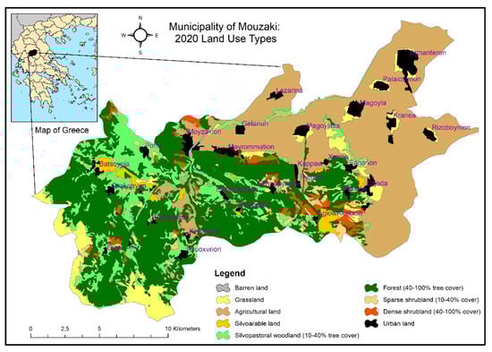 The research area is the administrative territory of the Municipality of Mouzaki, central Greece (31,326.97 Ha, Figure 1). The municipality includes 27 village communities populated by more than 13,000 inhabitants. Agricultural lands occupy 11,144.03 Ha (35.57%), silvoarable 556.38 Ha (1.78%), grasslands 2405 Ha (7.68%), silvopastoral woodlands (10–40% tree cover) 3815.39 Ha (12.18%), forests (40–100% tree cover) 10,573.64 Ha (33.75%), sparse shrublands (10–40% shrub cover) 503.74 Ha (1.61%), dense shrublands (>40% shrub cover) 784.99 Ha (2.51%), urban 1457.79 Ha (4.65%) and barren land 86.01 Ha (0.27%) (Figure 1, Nasiakou et al. []).