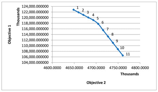 These points are important for policy makers as they present the trade-off between economic benefit f1(x) (Objective 1) and ecological benefit f2(x) (Objective 2). Knowing these values, policy makers are better informed as they can find a compromise solution between the two criteria and not just apply either the maximization of one criterion (point 1) or the maximization of the ecological one (point 11). They may, for example, choose point 6 which has an increase of 10.54% or 11,277,600.00 EUR in relation to the value that can be achieved of the expected profit when we only maximize the ecological benefit (point 11), but with a decrease of only 1.18% or 56,107.50 EUR in the environmental profit in relation to the environmental value f2(x) of point 11. The policy maker can observe the optimal areas for different points and choose his/her optimal policy in favor of one or the other area.