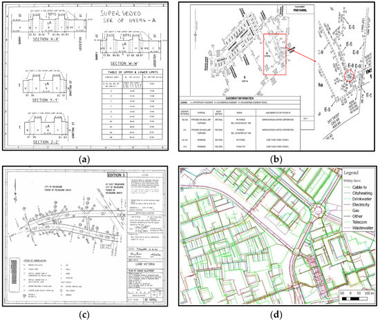 Current practices for managing legal and physical data of underground assets: (a) 2D cross-sectional diagrams for an underground car park with upper and lower limits, (b) easements as the ownership extent of underground utility networks in a subdivision plan, (c) a plan for an underground tunnel (plans source: [11]), and (d) a sample of utility data in a 2D environment without legal information, adapted with permission from ref. [12], Elsevier.