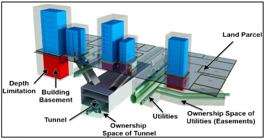The ownership of underground space is either an extension of the surface landowner’s ownership or separate underground space ownership by a stratum title [30]. Legislation for underground assets can be significantly different from surface infrastructure [40]. In other words, subsurface rights can be independent from surface rights, and the ownership of underground space can be identified as a separate property unit [4,41]. This means that underground land below the same parcel can be owned by different owners/actors at different depths [4]. Barker [42] noted that it is possible to legally separate underground land ownership from its surface parcel. For example, it is common to separate the ownership of minerals from surface ownership. It is also challenging to specify the geometric definitions of underground fluid and mineral resources based on surface land ownership [42].