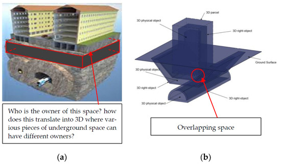 Some examples showing the importance of proper legislation for (a) defining the ownership of underground areas in 3D (Image source: [28]) and (b) revealing the overlapping space of the ownership extent of underground assets and preventing boundary disputes.