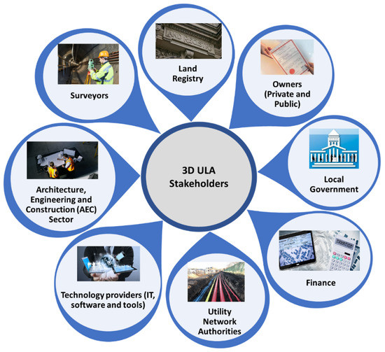 Identifying the key stakeholders in underground land administration is critically important in addressing institutional matters. Several private and public sectors have key roles in a ULA system, depending on different business and administrative processes, as well as private and governmental organisations in different jurisdictions. The identification of stakeholders requires a comprehensive study in each jurisdiction by considering use cases of 3D ULA. For example, the KLIP project in Flanders, Belgium identified the following stakeholders for underground utility management [33]: