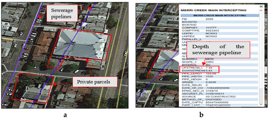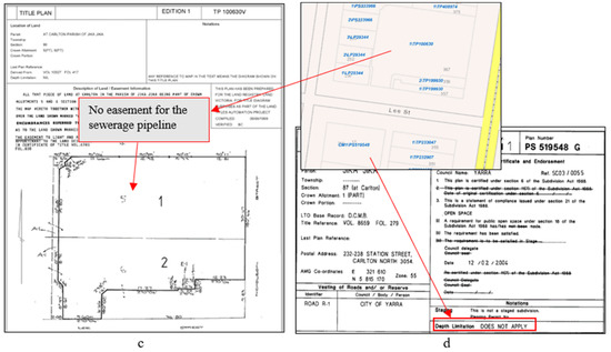 Underground data such as utility network data are often recorded, stored, and managed by their owners. However, their documentation needs to be adapted to the legal administrative process in order to protect people and secure real estate RRRs. Registering underground networks in one unique land register system makes the registration procedure more coherent and consistent [10]. However, in most countries, underground assets, especially utilities, are not displayed on cadastral plans and no public and up-to-date data exist [43]. In other words, cadastral representation (2D/3D) or other information on land parcel restrictions are not mostly available when legal objects are in the underground space [56]. For example, as seen in Figure 5a,b, a sewerage network owned by Melbourne Water Corporation, Victoria, Australia is located under some private properties in Victoria, Australia. However, for the space occupied by the sewerage network, there is no legal information such as easement in the 2D plans [57,58] (Figure 5c). As a secondary legal interest in the Victorian land registry system, some of these parcels (Figure 5d) do not have depth limitations [5], which could cause disputes for the space occupied by the sewerage network.
