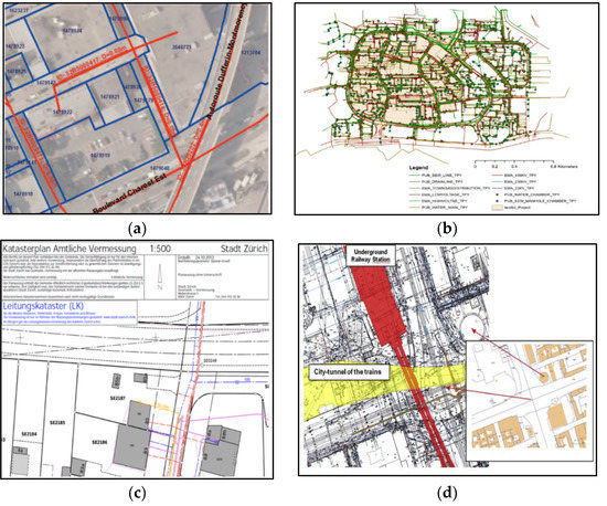 Some works on registering underground assets: (a) underground communication cables and 2D land parcels, Canada [10]; (b) utility networks and 2D land parcels, Singapore [62]; (c) utility cadastre, Switzerland [61]; and (d) subway data on a cadastral and base map, Poland, adapted with permission from ref. [63], Elsevier.