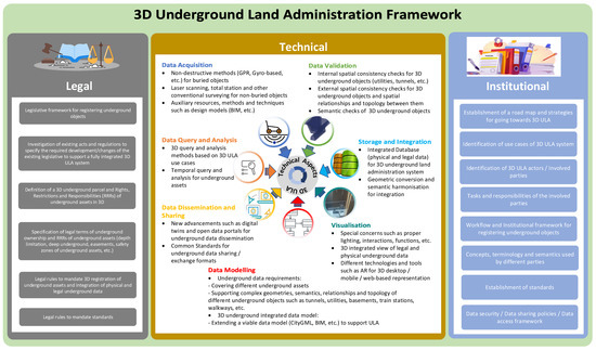 A holistic framework can provide crucial components of ULA. It is necessary for different jurisdictions to develop roadmaps for 3D ULA, which could also help to identify research gaps in this domain. Figure 7 presents the proposed framework in terms of the technical, legal, and institutional aspects. Addressing these aspects is necessary to transform the existing fragmented and isolated 2D underground land administration practices into a fully 3D digital environment.
