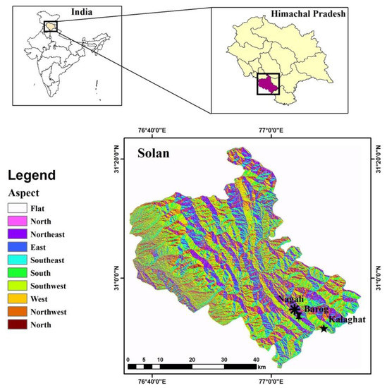 The structure and functions of Himalayan forests are believed to be changing over time, resulting in loss of forest diversity [35]. In most of the studies, the parameters pertaining to forest productiveness are overestimated because of the unaccountability of slope and aspects [36]. The ecological studies and biomass estimation along altitudinal gradients in forests of western Himalaya have been well documented over the years [37,38,39]. However, the literature reveals that very few studies report the effect of aspect in the northwestern Himalayas on forest ecosystems. For the effective management of forest ecosystems in the mid-hill of the Himalayas, there is an urgent need to know the key indicators that impact the tree characteristics, plant communities, forest biomass and its underlying soil with respect to elevation gradients, slope and aspect [7,36,40]. The objectives of our study were to test the hypothesis that different aspects (northern, eastern, western and southern) and altitudinal ranges influence the tree characteristics, vegetation biomass, total carbon stocks and physico-chemical characteristics of the soil. By taking into consideration these objectives, we shall be able to answer these above issues for the management and conservation prospective of forest ecosystems in the mid hills of the Himalayas. This study would be helpful in designing afforestation and reforestation programs for different altitudes and aspects in the mid Himalayas, for enhanced carbon sequestration and mitigating climate change.