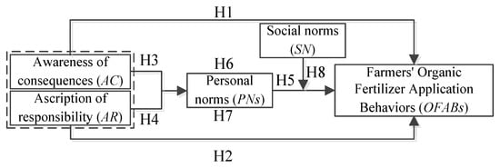According to the NAT, a PN is first activated by both AC and AR, which then have a direct effect on individual behaviors [,], including various pro-environmental behaviors [,]. If the PN prescribes action, an individual tends to take that action to avoid the foreseeable detrimental outcomes []. The clearer farmers’ awareness of the consequences of non-OFABs, the stronger the sense of responsibility for the negative consequences of non-OFABs, and the more likely that sense of responsibility will lead to the formation of PNs for their OFABs. Ultimately, this will all lead to a higher possibility of farmers applying organic fertilizers. In other words, when a PN related to the application of organic fertilizers by farmers is activated, any non-application of organic fertilizers may induce negative emotions (e.g., guilt or self-blame) in farmers. These feelings will further encourage farmers to adopt organic fertilizer application and other environmental behaviors in the agricultural production process. Therefore, this paper proposes the following research hypothesis: