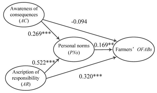 (3) The influence of PNs on farmers’ OFABs: The path coefficient of PNs on farmers’ OFABs is 0.169 and is significant under 5% confidence. This shows that the higher the PN of utilizing organic fertilizers, the stronger the willingness of farmers to apply organic fertilizers, and the more helpful the farmers will feel when purchasing and using organic fertilizer products. Therefore, H5 is confirmed, which is consistent with the current results [,]. Moreover, combined with the confirmed H3 and H4 in Part (2), we know that AC and AR can significantly promote the implementation of farmers’ OFABs via PNs. Thus, H6 and H7 are confirmed.