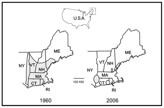 Historic and estimated range of New England cottontails in seven states within the northeastern United States. Populations in Vermont (VT) have been extirpated [].