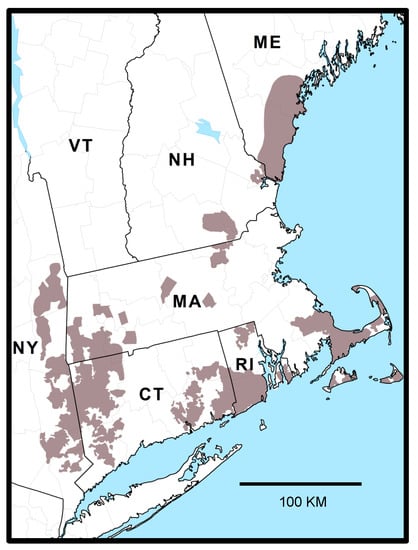 The New England cottontail (Sylvilagus transitionalis, here abbreviated as NEC) is a medium-sized lagomorph (1–1.4 kg, Figure 1) and is the only rabbit native to the New England region of the United States []. NECs are restricted to sites with dense understory vegetation, including native shrublands, beaver (Castor canadensis) flowages, old fields, and early-successional forests [,,]. Its historic range extended throughout much of the six New England states and eastern New York (Figure 2), a region that has experienced substantial land-use changes since European colonization [].