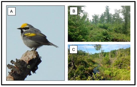 The golden-winged warbler (Vermivora chrysoptera, here abbreviated as GWW) is a migratory songbird that breeds in young forests and shrublands of eastern North America (Figure 4; []). In its breeding grounds, the species’ distribution is largely restricted to the Great Lakes and Appalachian Mountains []. There, GWWs nest within early-successional communities situated within otherwise heavily forested landscapes []. Within appropriate landscapes, GWWs nest on the ground, where their nesting cycle is completed in about 25 days []. After the young leave the nest, adults provide parental care for an additional 4 weeks within densely stocked stands of woody vegetation, such as regenerating forests or older forests with taller canopies and well-developed understories []. In most of their range, the nesting habitat is ephemeral (e.g., regenerating forests that occur following disturbance events), rarely remaining suitable for nesting beyond 15 growing seasons []. Like the NEC, the GWW initially benefitted from widespread abandonment of farmland across the northeastern United States []. However, regenerating forests matured and natural disturbances (e.g., beavers and wildfire) were not sufficient to reverse the decline of GWW populations [,]. Although more persistent nesting habitats exist (e.g., shrub wetlands), the availability of these communities is restricted mostly to the Great Lakes Region or very locally in the Appalachian Mountains (e.g., Pocono Plateau) [,].