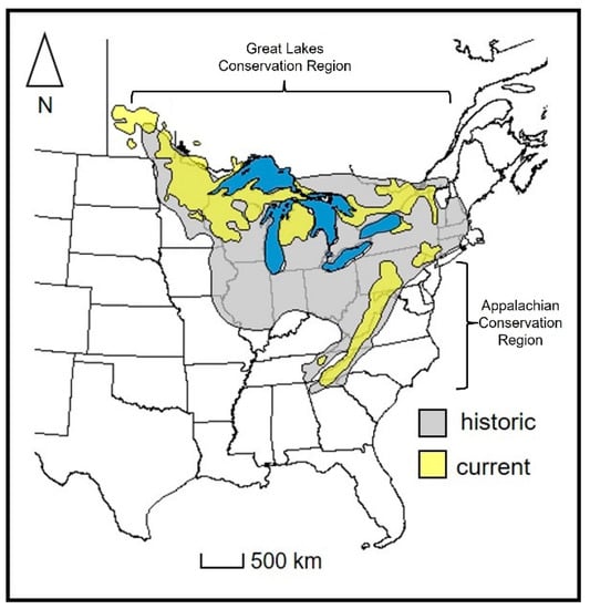 Since the 1960s, NEC populations have been declining. Although a number of factors have been implicated in the decline, including competition and hybridization with non-native eastern cottontails (S. floridanus), habitat loss via forest maturation and fragmentation seems to be the most parsimonious explanation for the range-wide decline []. The remaining habitats are often small, isolated patches of shrublands or young forests. Combined, populations of NEC are now restricted to five geographically disjunct locations that collectively occupy <15% of the historic range (Figure 2) []. Small patches of habitat support few rabbits that are exposed to high rates of predation [], and these habitats are embedded in substantially modified landscapes [,]. The abundance of early-successional forests and shrublands in the region continues to decline [,], so without intervention, the long-term viability of NEC populations is unlikely [,,]. As a result, the NEC was listed in 1989 as a candidate species for threatened or endangered status [].