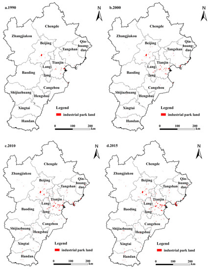 Spatial distribution of major industrial parks in the Beijing–Tianjin–Hebei region from 1990 to 2015.