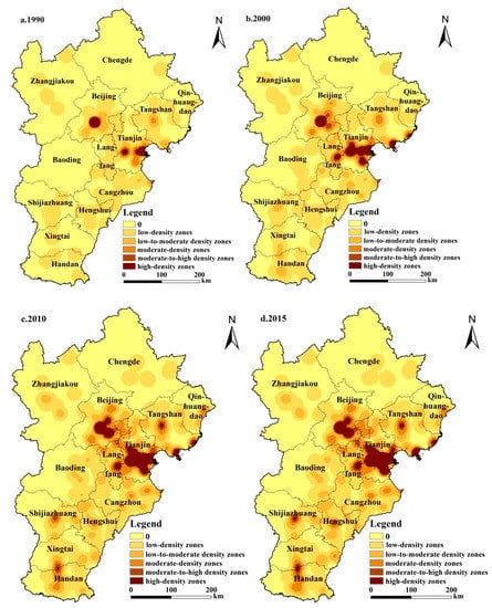 where is the density estimation for the location ; is the kernel density function, where is the distance between the location and the i-th observation point; h is the distance diminishing threshold; and n is the number of point features observed within the threshold. KDE can be used to analyze point or line features. Since the data collected for this study were vectorized plane data associated with industrial parks, they were converted to point features, which were then processed using the Kernel Density Tool in the ArcGIS spatial analysis toolbox. For this study, we first extracted the gravity centers of spots representing industrial parks in the Beijing–Tianjin–Hebei urban agglomeration in 1990, 2000, 2010, and 2015. After several trial calculations, we finally set the distance diminishing threshold h at 20 km. The weights were set as the spot area for the kernel density analysis of industrial parks’ land use. Natural breaks were used to classify the industrial parks into low-density, low- to moderate-density, moderate-density, moderate- to high-density, and high-density zones. In this manner, we obtained the distribution of industrial parks’ land use density in the Beijing–Tianjin–Hebei urban agglomeration for the specified years.