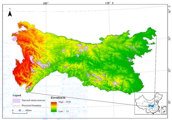 The Qinling–Daba Mountains are located between 30°–36° N and 101°–114° E, spanning Sichuan, Gansu, Shaanxi, Chongqing, Hubei, and Henan provinces. This region has a width of approximately 300 km from north to south and a length of approximately 1000 km from east to west, with a total area of around 300,000 km2 and an altitude range of 13–5528 m (Figure 1). The Qinling–Daba Mountains sit in the transitional region from the northern subtropical zone to the warm temperate zone, serving as an essential ecogeographical transition zone and a natural dividing line of climate in China. Within this transition zone, the topography varies significantly, and its natural geographical location has led to complex horizontal and vertical distribution patterns of vegetation coverage. The northern slope of the Qinling Mountains is mainly covered by warm–temperate deciduous broadleaved forests, while evergreen–deciduous, broadleaved mixed forests cover the southern slope. The northern slope of the Daba Mountain is connected with the southern slope of the Qinling Mountain, and the vegetation types on these slopes are similar. The southern slope of the Daba Mountains is covered by subtropical evergreen broadleaved forests. The regional vegetation and temperature change with altitude, showing obvious vertical zonality [,]. The Qinling–Daba Mountains are one of the 17 vital Biodiversity Ecological function zones identified in the National Major Function Zone Planning of China. The region has a large population with a scattered distribution, and the mountainous area between the Qinling and Daba Mountains is economically under-developed and has prominent problems with poverty, making it an important concentrated contiguous special hardship area in China. Effective management by local governments has led to the integrated development of land resources, but the partition management mode has made the natural habitat more fragmented. By the end of 2015, there were 26 national nature reserves in the Qinling–Daba Mountains, with a total area of approximately 1.47 × 104 km2 accounting for 5% of the entire land area of the Qinling–Daba Mountains, and 43 local nature reserves with a total area of 1.09 × 104 km2 accounting for 3.6% of the land area, which is lower than the global average (12%). In this study, we selected ten national nature reserves according to the division of land-use types and their indicative levels in the north–south transitional zone [,] as shown in Figure 1.