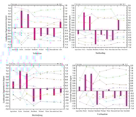 The degree of landscape fragmentation from the core areas to the experimental areas in the interior of the Qinling–Daba Mountains nature reserves was low in the middle and high in the surrounding areas. The level of landscape fragmentation gradually decreased from the edge of 1 km (M-1) to 5 km (M-5). Human activities were relatively intense around the edges at 1 km (M-1), and the degree of landscape fragmentation in these areas was found to be high. The spatial distribution of fragmented landscape patches in the nature reserves were differentiated. The high-value areas appeared in the regions with intense human activities, and the low-value areas were located in the regions with mild topographic relief.